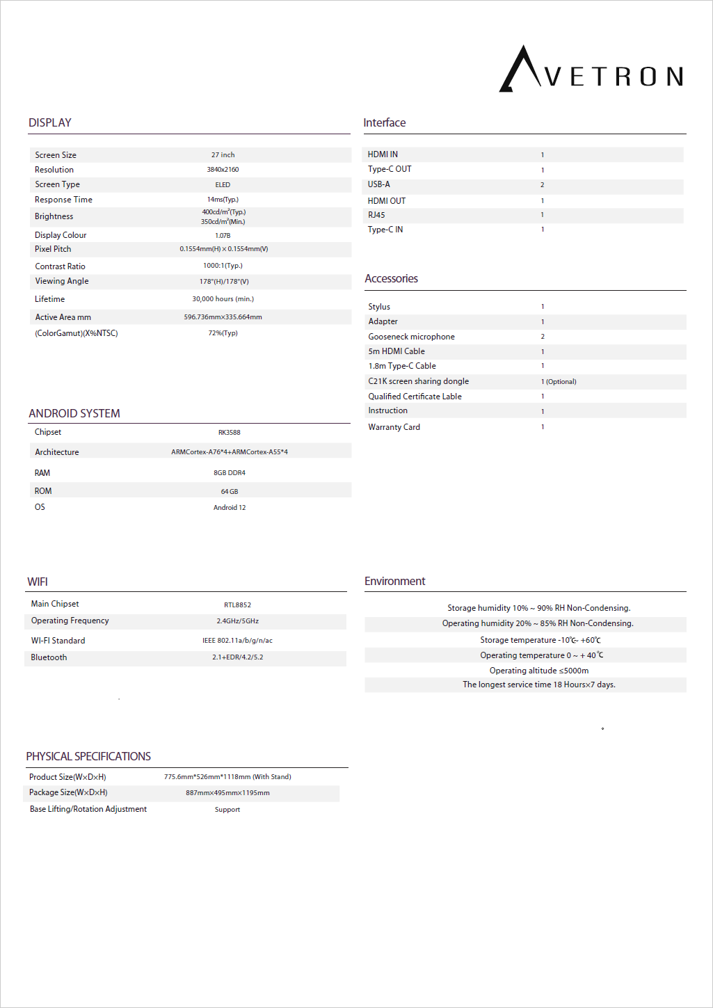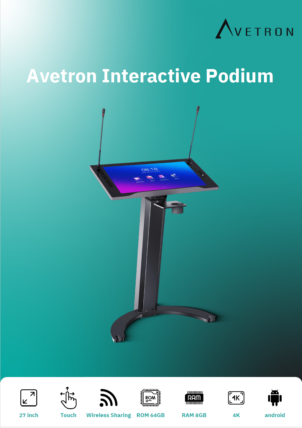 Avetron Interactive Podium with 27″ 4K Display, Android 12, 8GB RAM, 64GB ROM, Touchscreen & Wireless Sharing