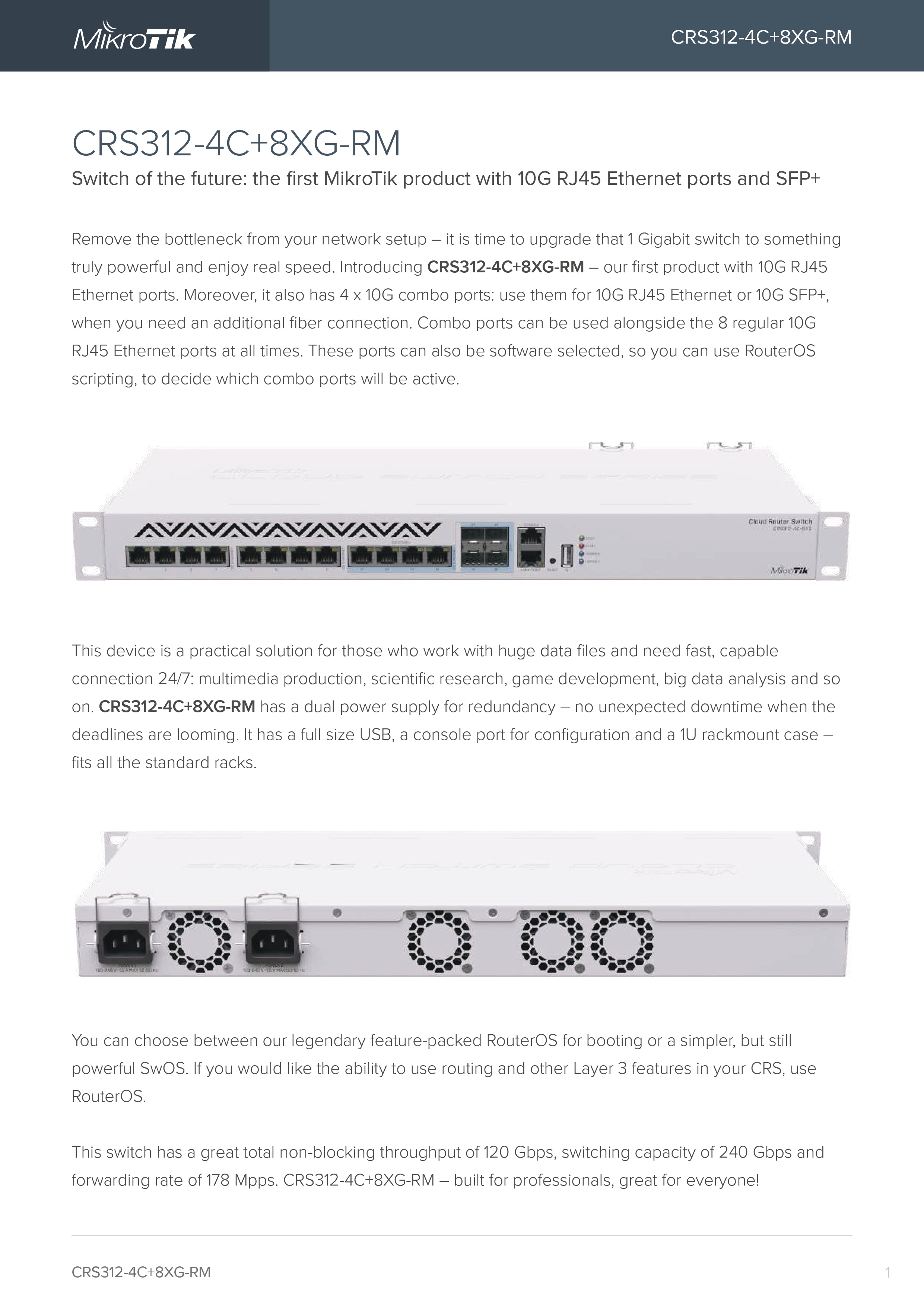 Remove the bottleneck from your network setup – it is time to upgrade that 1 Gigabit switch to something truly powerful and enjoy real speed. Introducing CRS312-4C+8XG-RM – our first product with 10G RJ45 Ethernet ports.