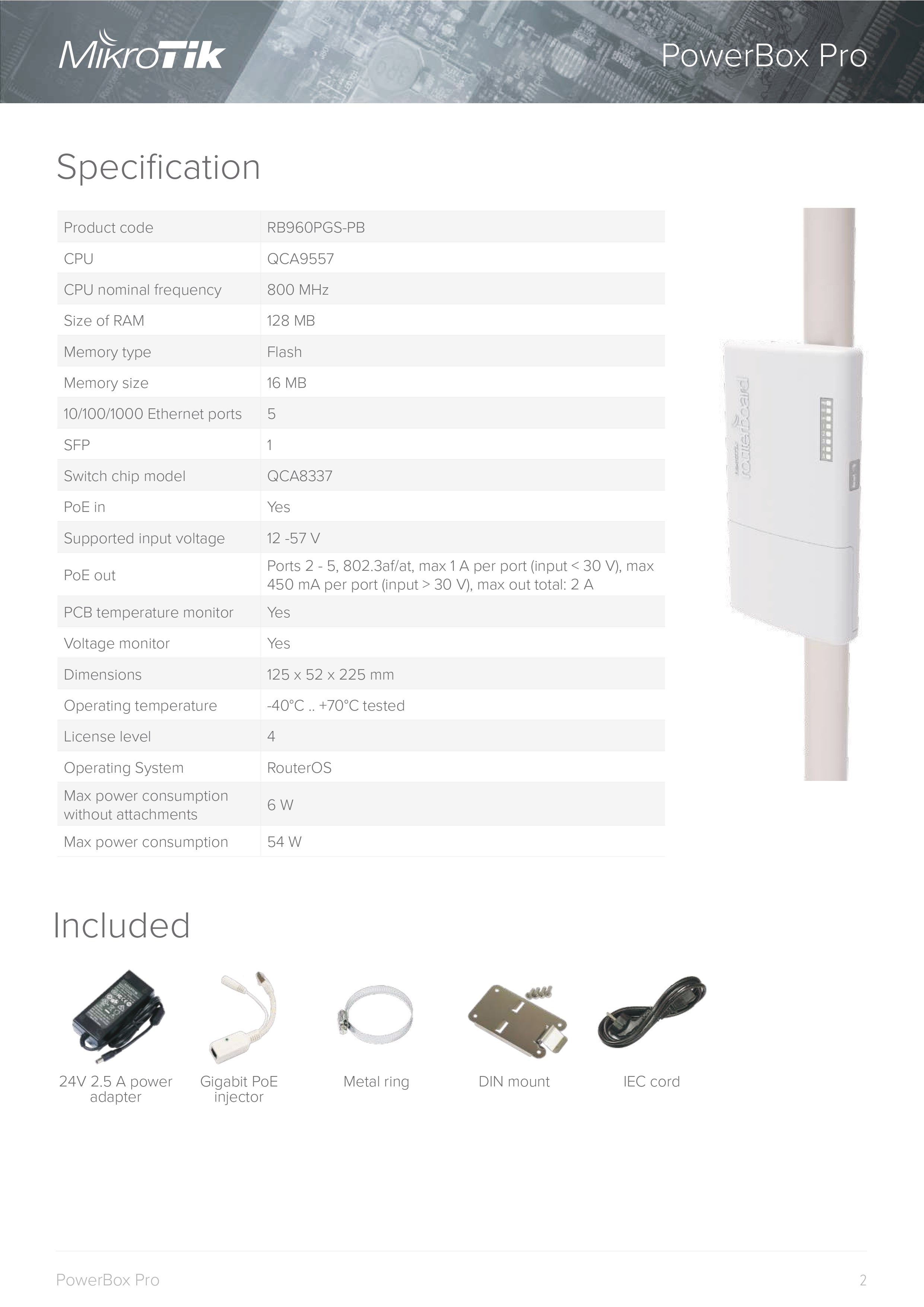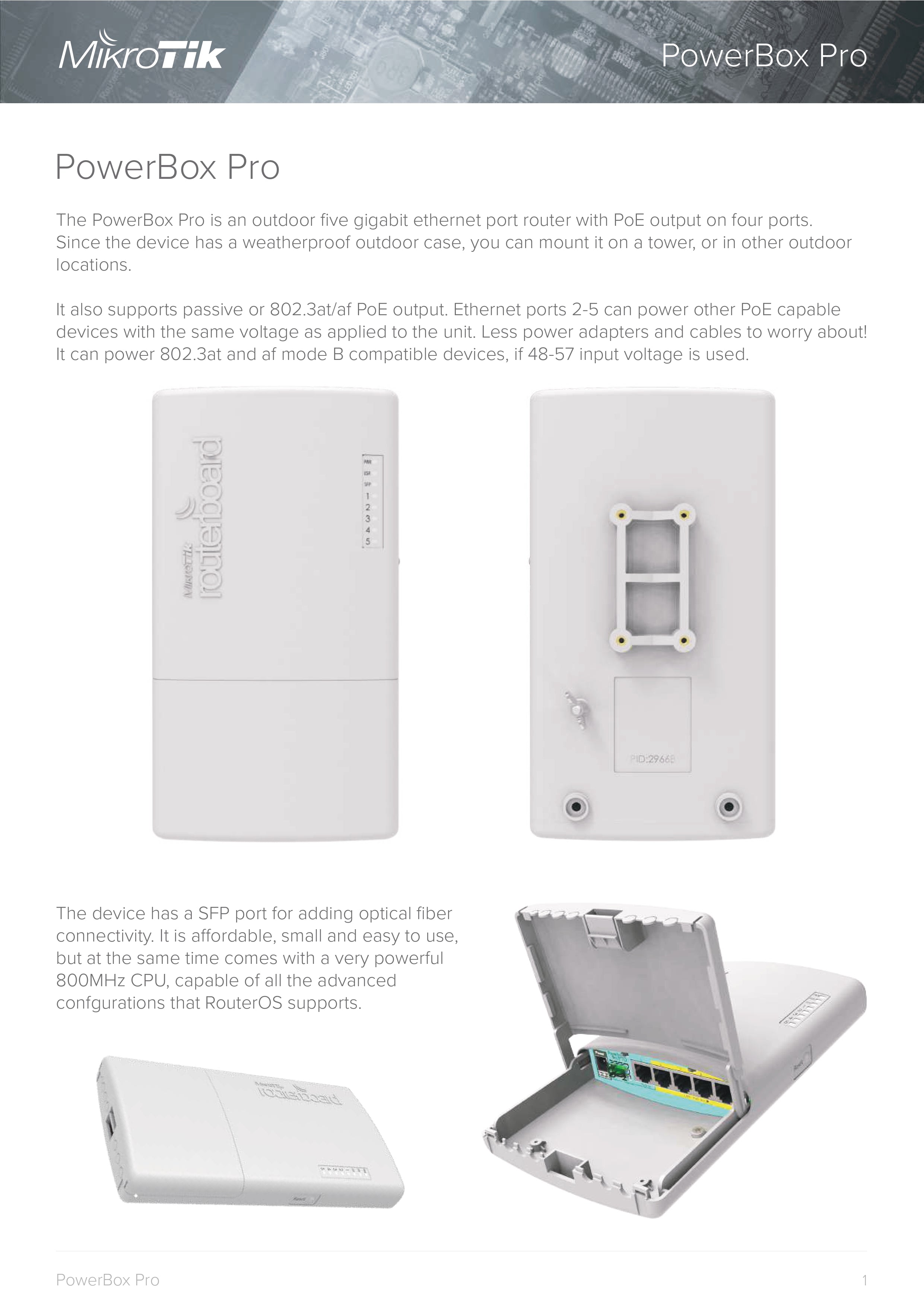 MikroTik RouterBOARD PowerBox Pro – 800MHz CPU, 128MB RAM, 5x Gbit LAN, 4x PoE-Out, SFP, outdoor case, PSU, DIN/pole mount, RouterOS L4