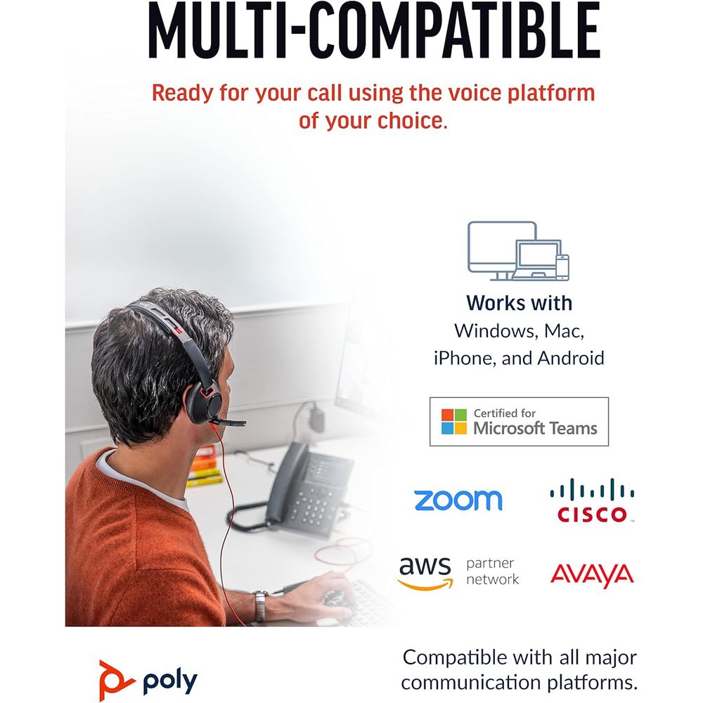 Poly Blackwire 5200 Series USB Wired Headset – Stereo or Mono, USB‑C/A + 3.5mm, Noise‑Cancelling Mic, Dynamic EQ, UC Certified