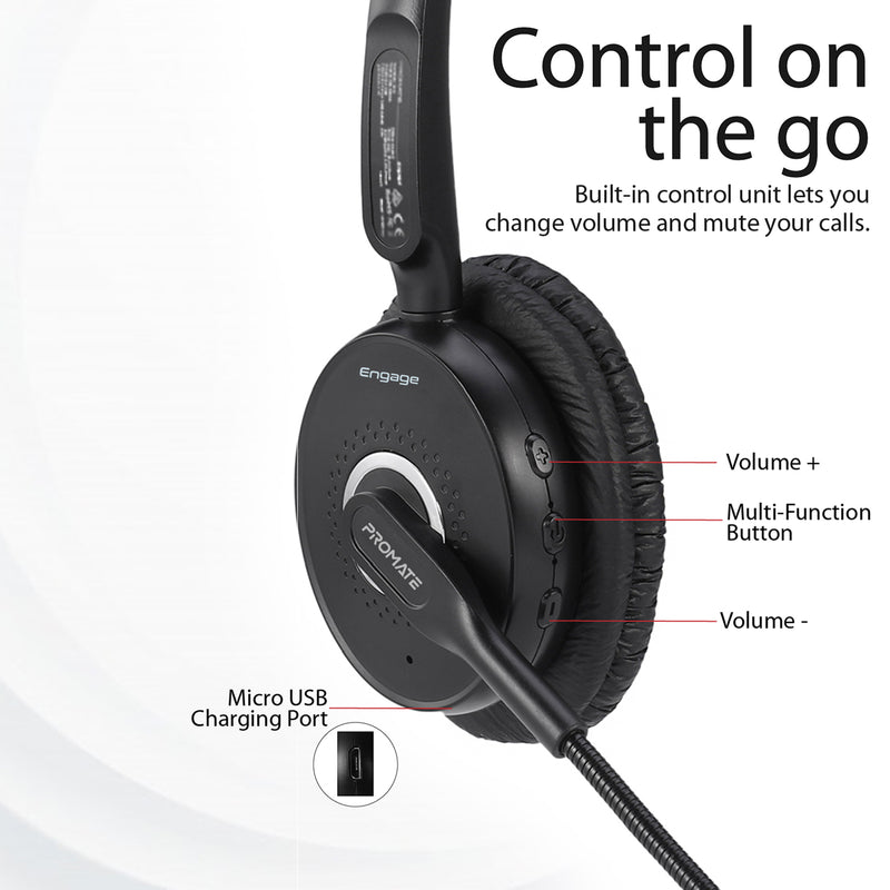 Promate Engage Over-Ear Mono Bluetooth Headset – HD Voice, Noise-Cancelling Mic, 14h Talk Time