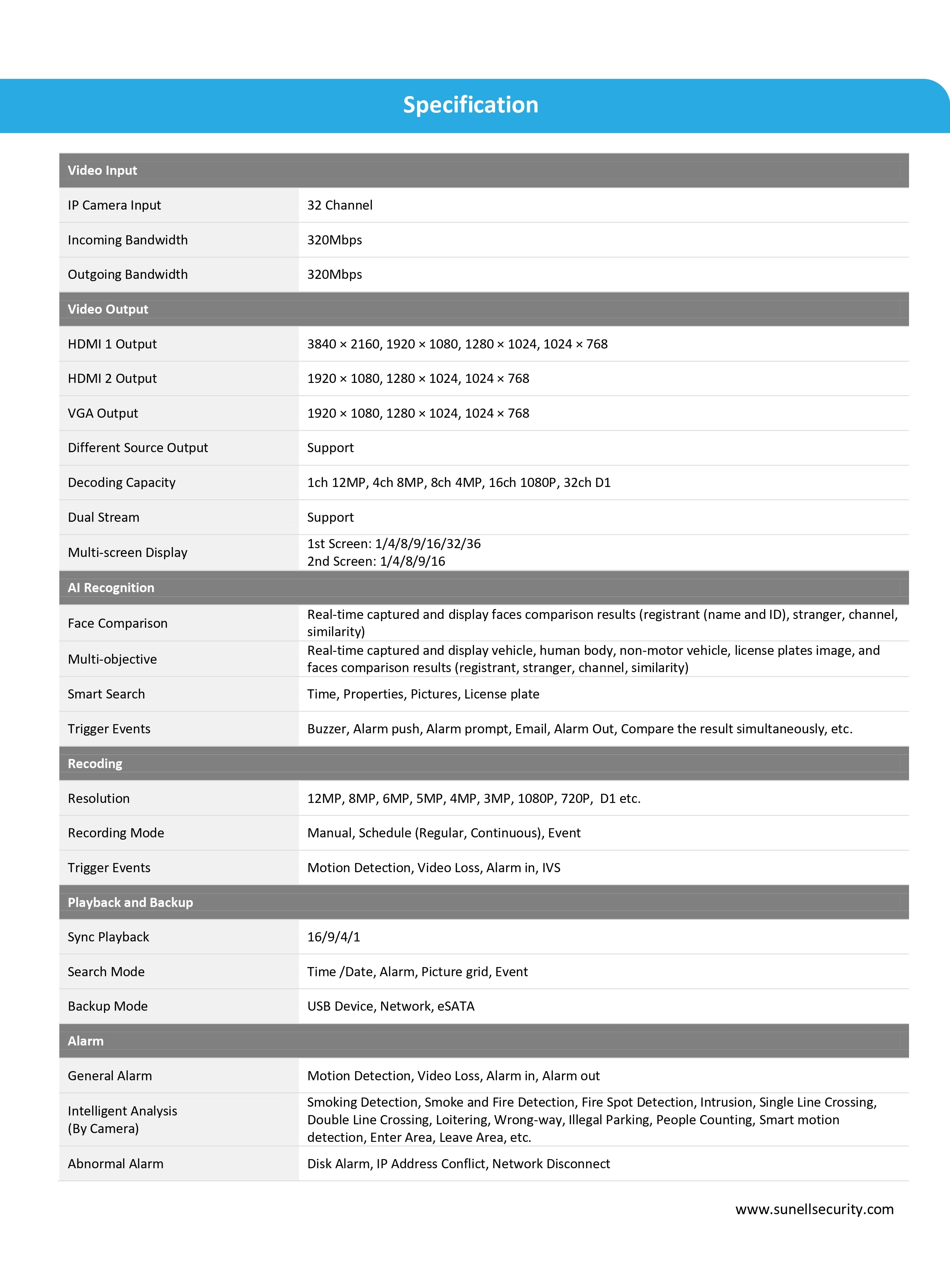 | Decoding Capacity | 1×12MP, 4×8MP, 8×4MP, 16×1080P, 32×D1 |