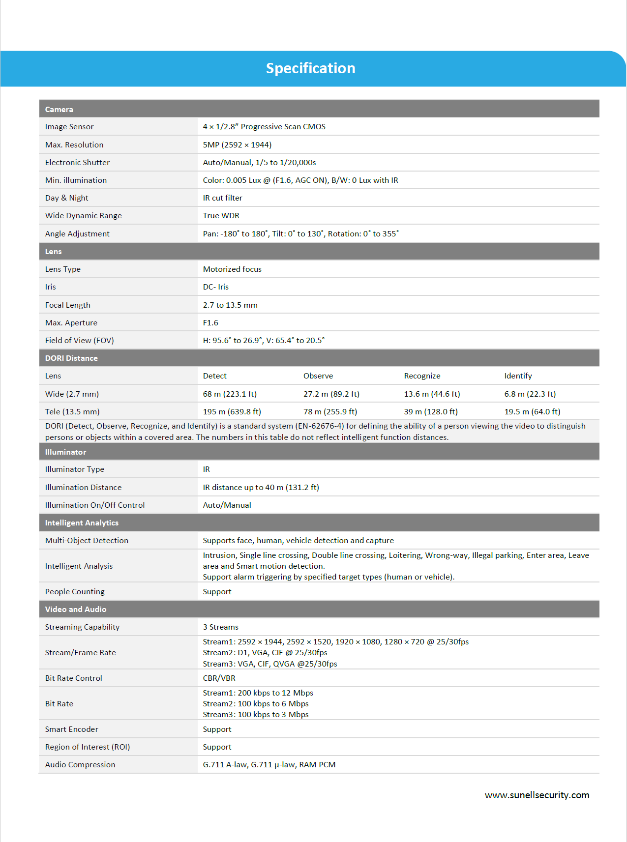 - Lens: 2.7–13.5mm motorized varifocal lens per sensor