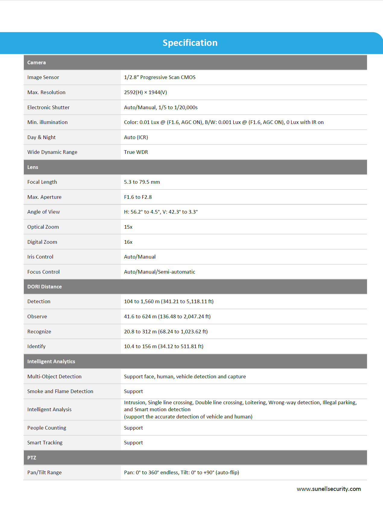- Optical Zoom: 15x (5.3–79.5 mm) with 16x digital zoom for detailed long-range monitoring.